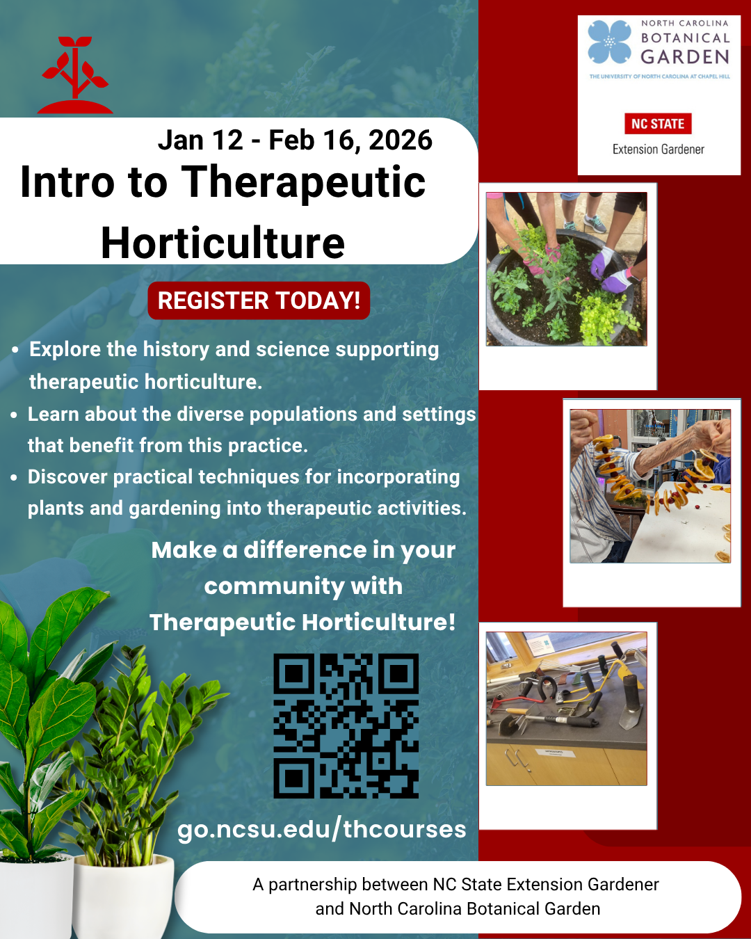 Collapse ▲Introduction to Therapeutic Horticulture (TH1) welcomes learners into the January 2026 online non-credit course January 12 – February 16 in partnership with the North Carolina Botanical Garden. This course has no prerequisites, and learners can complete the materials at their own pace during each week of the course. TH1 is the prerequisite for other courses in this series, and is a thorough introduction to the practice. Register here: Introduction to Therapeutic Horticulture