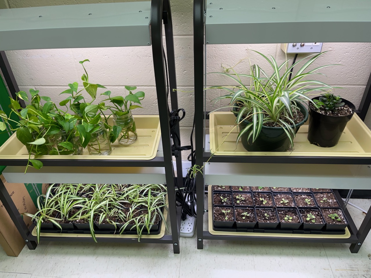 The students involved in this program participate in a variety of activities including house plant propagation, house plant maintenance, plant pest and disease management, plant marketing and sales, and giving back to the school community through plant donations and giveaways. Indoor house plants we have propagated include: spider plants, tradescantia zebrina, golden pothos, monstera adansonii, vicks plant, Cuban oregano, and Mexican mint to name a few. Students have also propagated outdoor plants including African blue basil, a variety of coleus, and garden peas. They have also grown, harvested, and tasted microgreens in the classroom. Each classroom has their own plant light shelf so plants the students propagate stay in the classroom and they get to see them grow and change. Ideally, students in the classroom are given the responsibility of watering the plants once per week. I also come by weekly to check on the light shelves to be sure the lights and timers are working correctly.